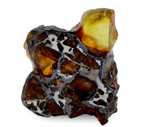 Description: The Golden Pallasite is arguably one the most beautiful and sought after pallasites available on the market today. With large golden olivine crystals embedded in its' sulfur enriched iron-nickel matrix, the Golden Pallasite is a wonder of nature. Its name is not actually derived from the honey colored olivine crystals, but rather metal sulfides in the matrix, similar to pyrite, that can cause large areas of the exterior to have the appearance of a high polished golden sculpture. The best of these specimens can be exceptionally stunning!