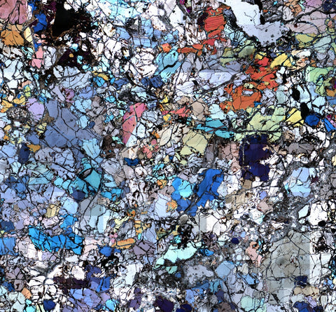 Raman optical micrograph of NWA 15915 from LMAC Laboratory for Meteorite Analysis and ClassificationAbove: Raman color enhanced micrograph taken of a petrographic thin section of NWA 15915.