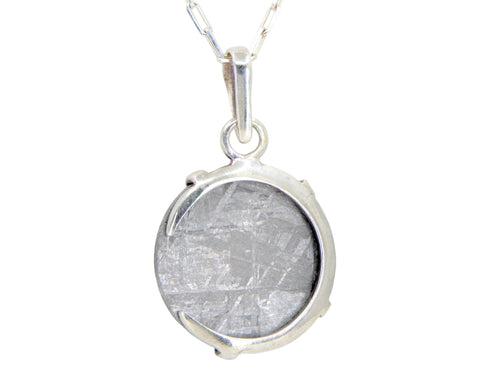 Description: This meteorite pendant has been  handcrafted from Gibeon iron meteorite and etched to show the characteristic Widmanstätten pattern which is indicative of a cooling process that takes millions of years. This very slow cooling and crystallization of two different iron-nickel alloys within the cores of larger asteroids is the only place in the universe these patterns are known to form. These unique Widmanstätten patterns are only found in iron meteorites and the planetary and asteroidal cores where they are formed. The meteorite piece is then set in a crescent moon made with sterling silver to make this unique and beautiful pendant.
