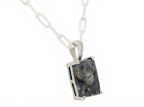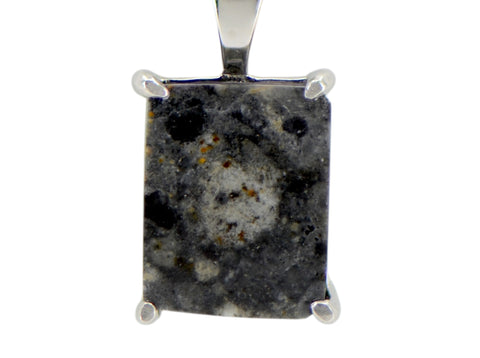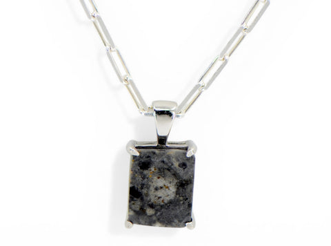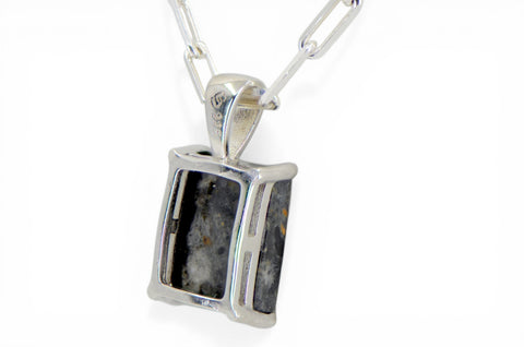 Description: Monolith Moon is a unique handcrafted Lunar Meteorite Pendant with center stone fashioned from a piece of the Moon. Made from the beautiful lunar meteorite NWA 16530 and set in Sterling Silver. Accompanying Sterling Silver necklace is available.