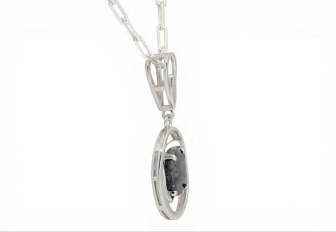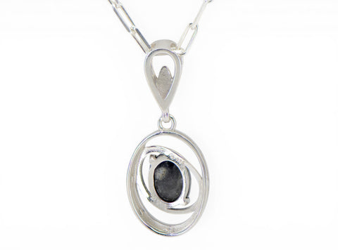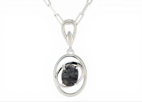 Description: Moon Orbit is a unique handcrafted Lunar Meteorite Pendant with center stone fashioned from a piece of the Moon. Made from the beautiful lunar meteorite NWA 16530 and set in Sterling Silver. Accompanying Sterling Silver necklace is available.