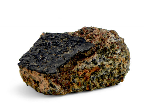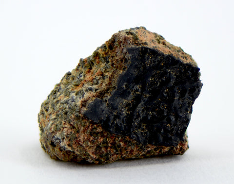 Physical characteristics: The exterior is partially covered by black fusion crust. Freshly broken surfaces reveal a mixture of mm-sized dark-green pyroxene grains and interstitial cream-colored feldspar.